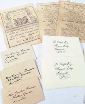 Poldark (BBC Drama Series 2015-2019 starring Aidan Turner) - a collection of x15 production made props and set dressing items, to include: letter from Captain Ross Poldark, two partial letters, various envelopes with wax seals, a Warleggans Private Loan Agreement, theatre advertisements, James Bly 'Seller Of Plants and Fruit', and other props. Some likely screen used. All production made items. Various sizes and condition.