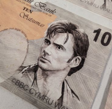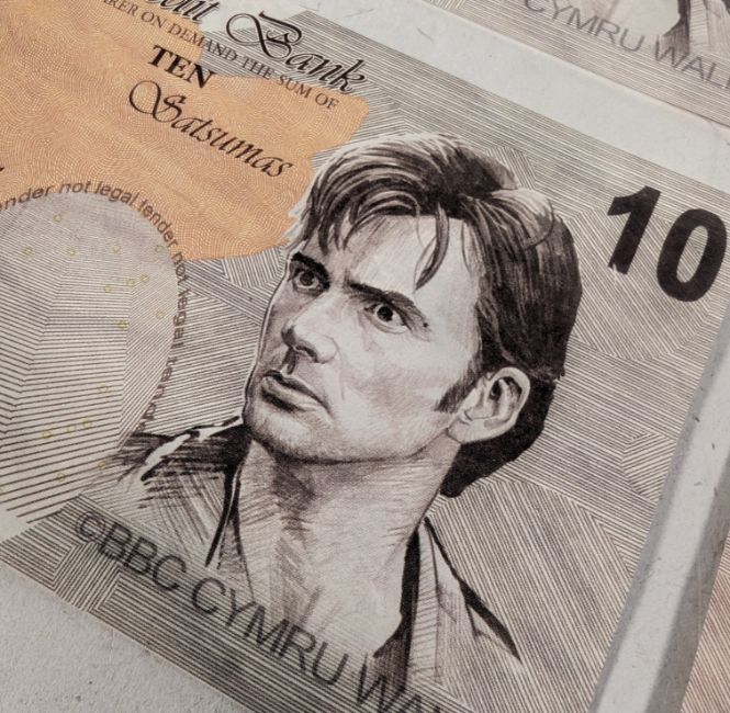 Doctor Who (BBC science fiction series 1963 to present) - The Runaway Bride (2006 Christmas Special from the Tenth Doctor era) - four original production used prop bank notes, made for the scenes in which money is seen spewing from ATMs. Each bank note was custom printed by the props department, and these examples are based on a ten-pounds note. A depiction of David Tennant replaces the Queen's head and various text changes alluding to the production feature. Measures 8cm x 15cm each. (4)