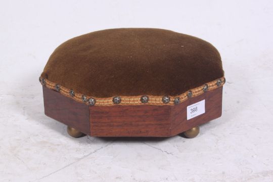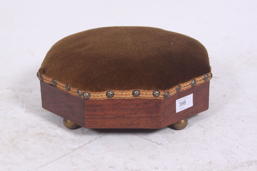 A Georgian mahogany octagonal footstool being raised on brass feet with upholstered centre. 12cms x 30cms