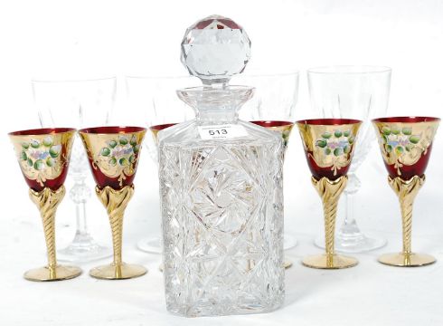 4 matching crystal decanters and 6 other coloured glasses