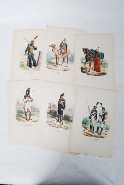 Hippolyte Bellangé; set of six 19th century hand coloured engraved prints by Andrew Best Lolier, each picture of a soldier, titled to base with signatures printed to base. 27cm x 17cm