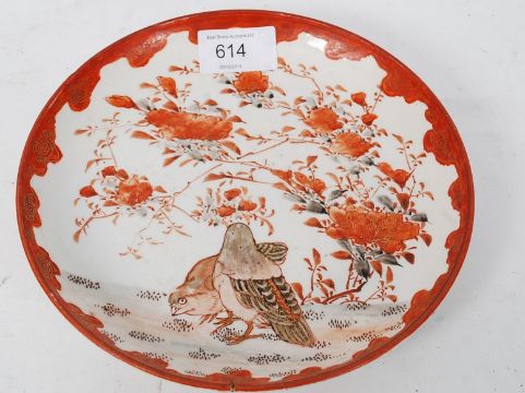 A 19th century Japanese Satsuma plate being signed to the verso by the artist. The decoration of birds and fauna in ironstone red. Measures 19cms high.