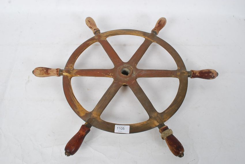 A Mid - 20th century bronze and wood ships wheel, 58cm from point to point. Provenance; removed by the vendor from the Margaret Root Yacht, often frequented by stars of stage and screen, most notably Frank Sinatra.
