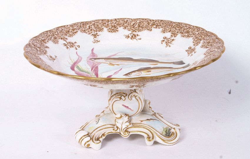 A good 1904 Worcester Vitreous 68547 hand painted fruit bowl. The top, sides and undersides being hand painted with fish / underwater scenes. Retailer and Worcester marks to base for F. Crook. 25cm diameter