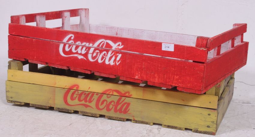 2 wooden painted crates of large form bearing notation for Coca-Cola. H16cm x W76cm x D48cm