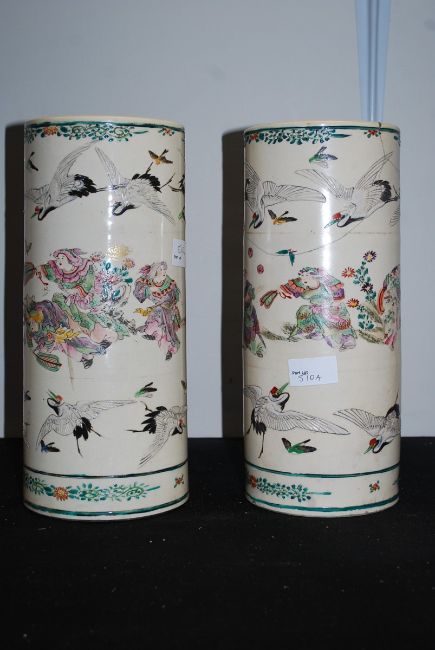 A pair of 19th century Chinese oriental hand painted cylindrical vases. Painted scenes depicting treetop happenings, painted in raised form with birds. 31cm tall.