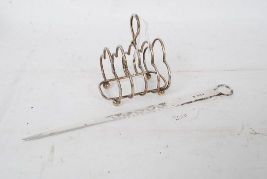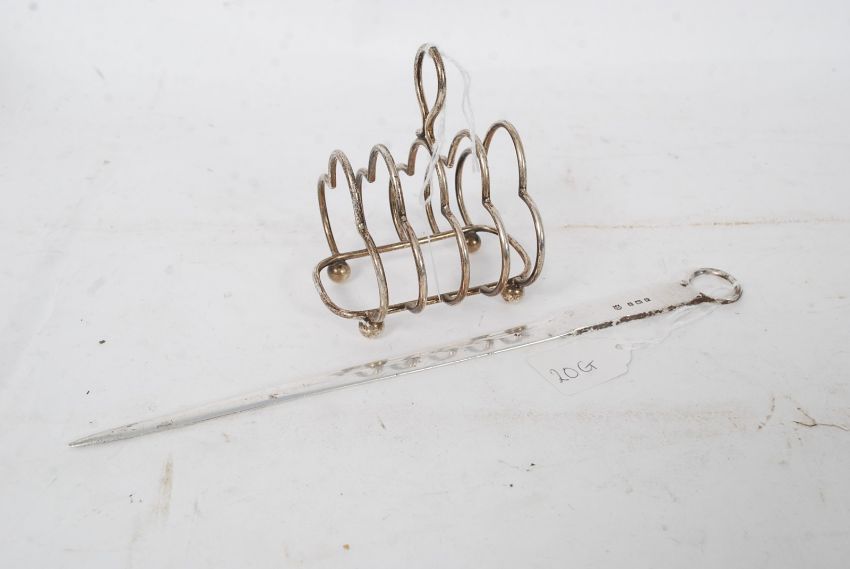 A silver hallmarked meat skewer bearing 1905 Birmingham hallmarks together with a silver toast rack hallmarked for Birmingham. Weight 147 grams