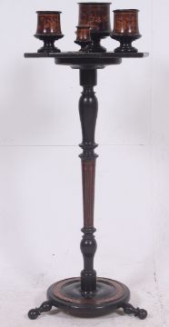 A decorative 20th century ebonised Victorian mahogany tripod smokers stand complete with the inset jars atop. H72cm x D31cm