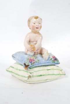 An unusual 20th century porcelain figurine of a cherub / small child raised on a cushion base. Bearing IC mark under crown