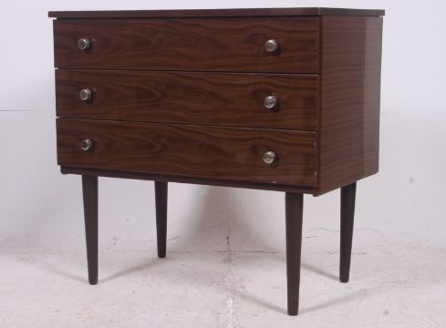 A retro 1970's Schreiber 3 drawers chest of drawers raised on tapered supports with laquered finish. 72cms x 79cms x 43cms
