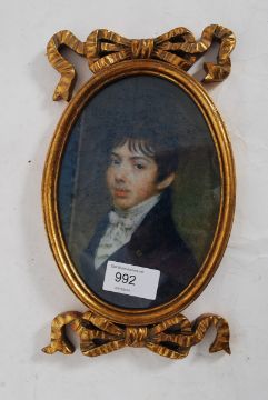 An antique style gilt framed printed portrait miniature of a young gentleman.
