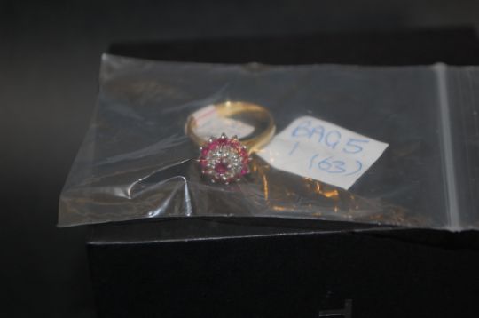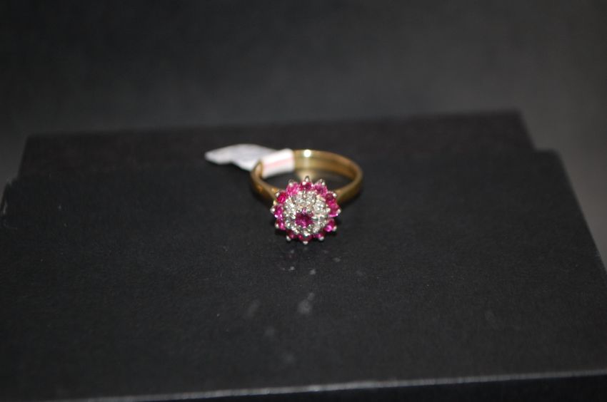 18ct gold ruby and diamond cluster ring. Size L.5. Weight 4g.