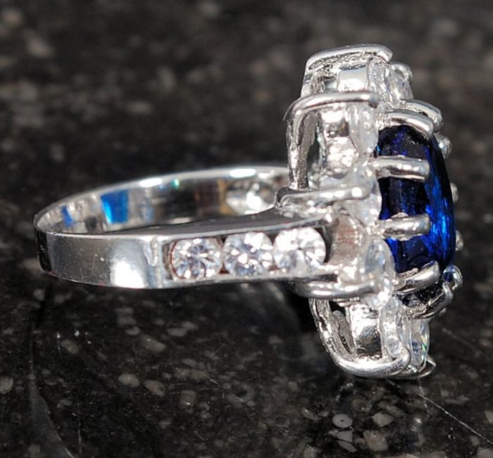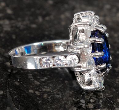 A silver ring set with synthetic saphire and CZ