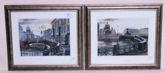 A pair of watercolour paintings depicting a ''view of the st. Elsac's cathedral ". Signed by artist at the margin in pencil. Measures:17cms x 23.