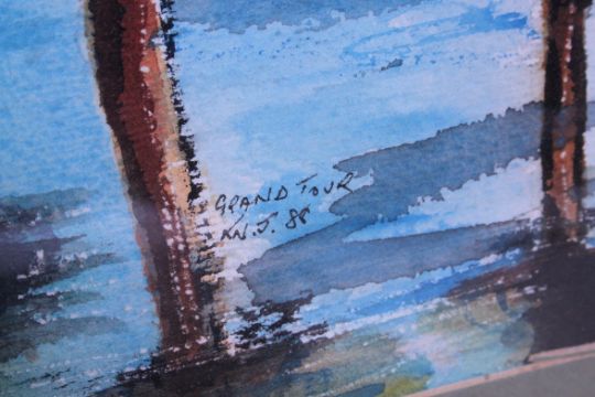 A 20th century Italian Venice scene watercolour painting signed and marked ' Grand Tour ' KNJ 88. Measures 46cms x 33cms