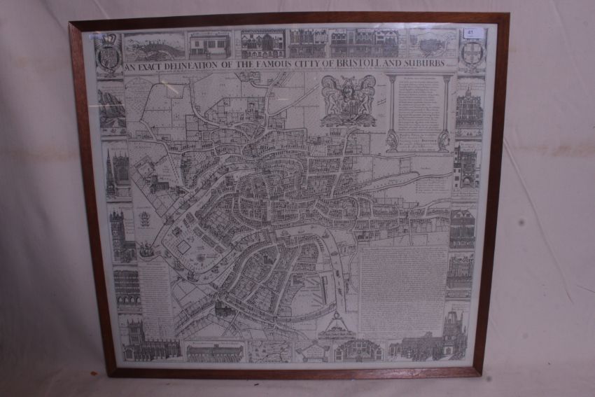 A framed and glazed large old map of Bristol entitled ' An exact delineation of the famous city of Bristol and its suburbs. Measures 73cmx x 81cms