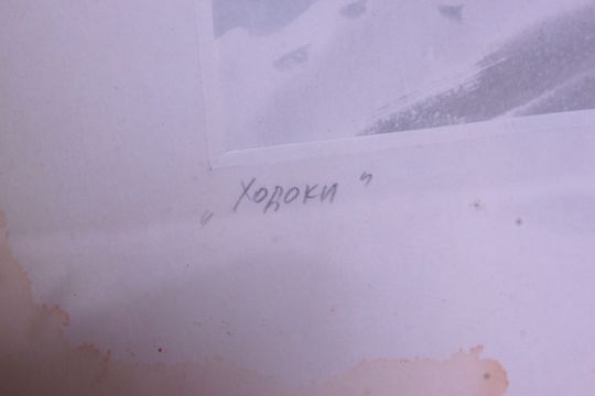 A watercolour painting of people emigrating in bad weather,signed by artist at the lower corner in pencil. Measure: 27cms x 18cms.