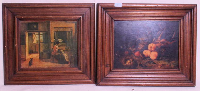 A pair of prints on board,unmarked and unsigned, depicting a child crying on mothers lap, and a mixture of fruits together with a butterfly and a basket with eggs. Measures:25cms x 35cms.