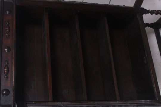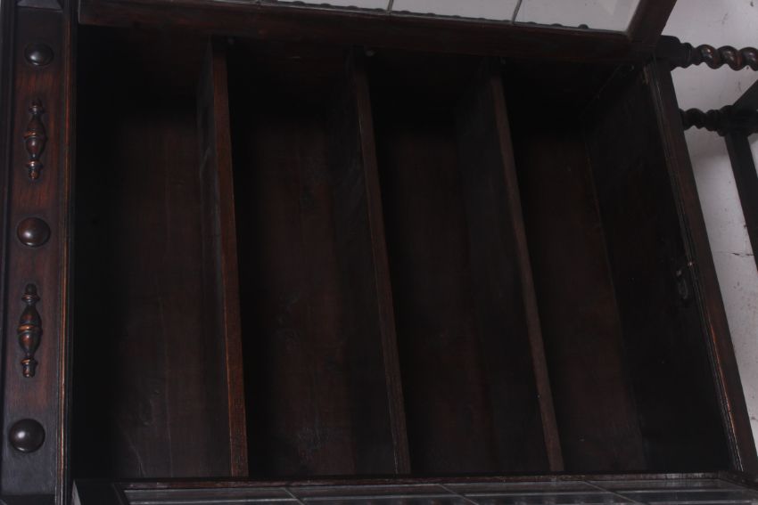 A 1930's oak barleytwist bookcase display cabinet. Raised on barleytwist supports having stretchers with twin door cabinet atop. Measures: 139cms x 92cms x 30cms.