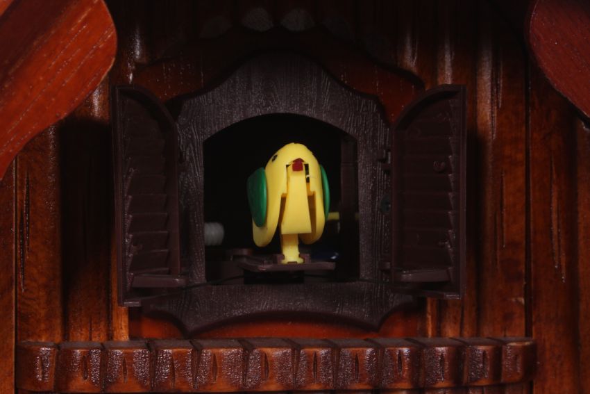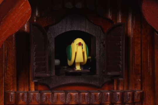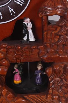 A contemporary cuckoo clock having central action with chains and weights beneath
