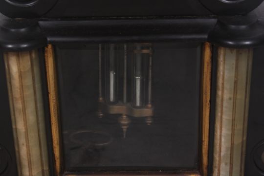 A 19th century French 3 piece clock garniture / A FRENCH CLOCK GARNITURE. late 19th century the 8 day movement signed Marcel Corpet striking on a bell and with exposed mercury pendulum, white enamel chapter ring with Roman numerals. The case being slate having green marble columns with scrolled sides and fluted pilasters en suite with a pair of tazza