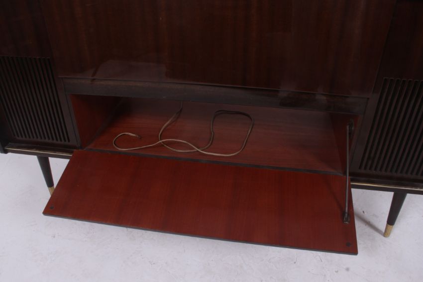 A vintage 1960's laquered radio stereogram by grundit having flip over top being raised on tapered supports. Measures: 81cms x 136cms x 45cms.