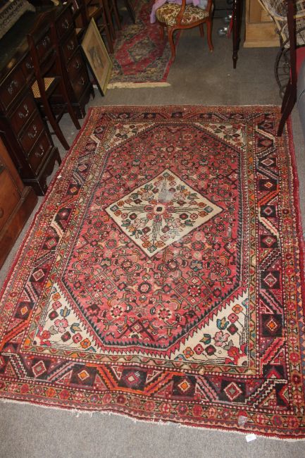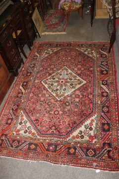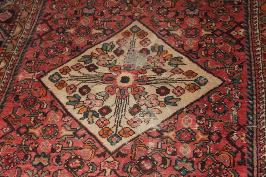 An early 20th century handwoven rug having red ground with geometric patterns. Measures 27" Wide x 97" long