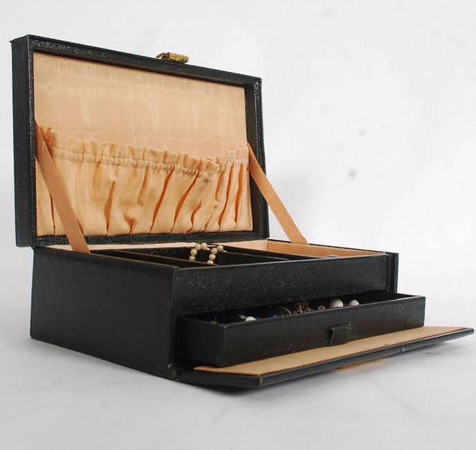A good leather early 20th century ladies jewellery box with brass London made lever lock complete with the key having lined interior with some contents