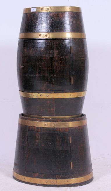 A good coopered oak drinks cabinet on stand, The brass bound oval barrel having central door with shelved interior. Raised on half barrel stand. H107cm x D53cm x W40cm