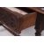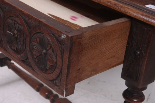 A 19th century French oak writing table desk. Raised on tapered supports united by stretchers having carved detailed drawers to front with flared desk top above having cupboards to the upright rear.