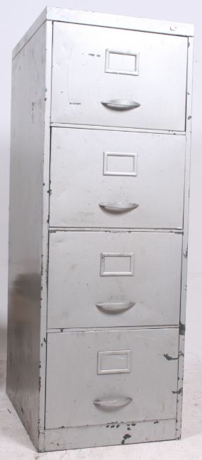 An Industrial 20th century metal office upright thin filing cabinet dating from the 1970's complete with notation slides and original handles