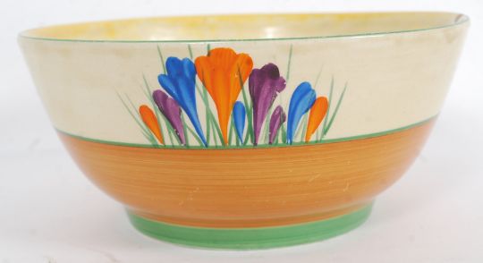 A Clarice Cliff Crocus Hand Painted Bizarre bowl having foliate and banded design being stamped to the base. Measures 16cms diam.