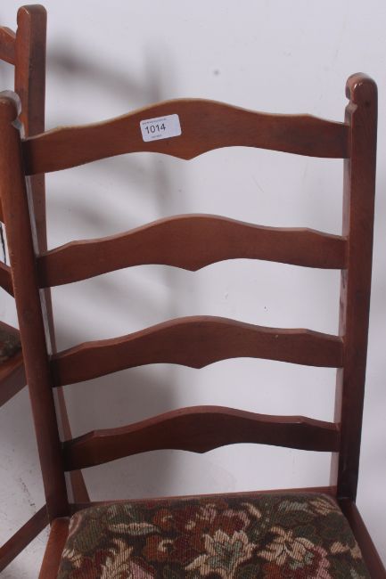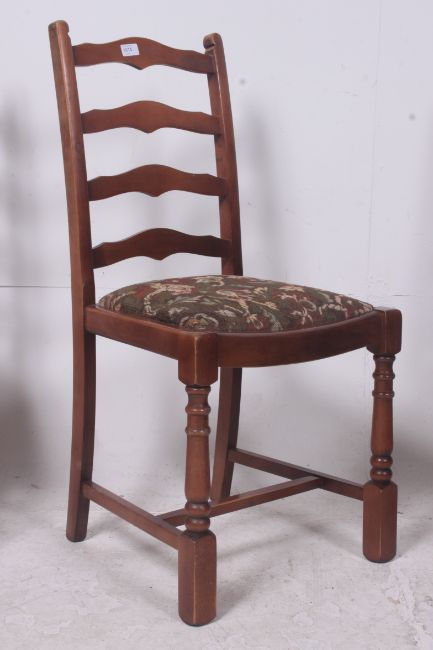 A set of 4 mid 20th century ladderback dining chairs with tapestry drop in seats and wavey ladder back rests. Measures: 94cms x 45cms x 42cms.
