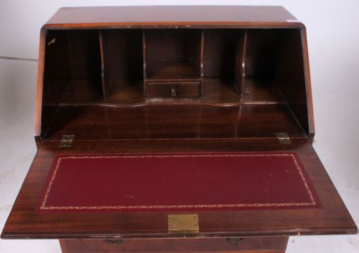 A good Queen Anne revival burr walnut writing bureau desk. Raised on a plinth base with fall front slope having appointed interior within. All over chest of drawers beneath. Measures: 101cms x 77cms x 43cms.