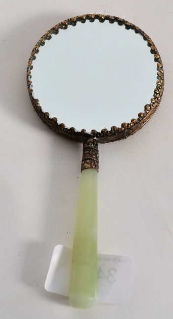 An early 20th century ladies jade vanity mirror having ceramic plaque to verso with famille rose scene in enamels