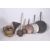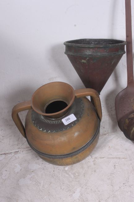 A collection of 19th century copper skillets together with other copper utensils along with a brass ewer