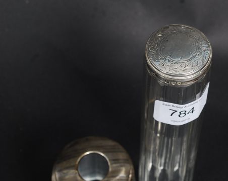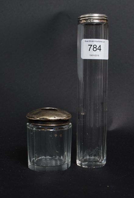 Two hallmarked silver topped glass pots.
