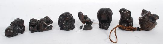 A collection of wooden Japanese Netsukes to include horse, monkey, frog, mouse, bird, rabbit, dogs etc