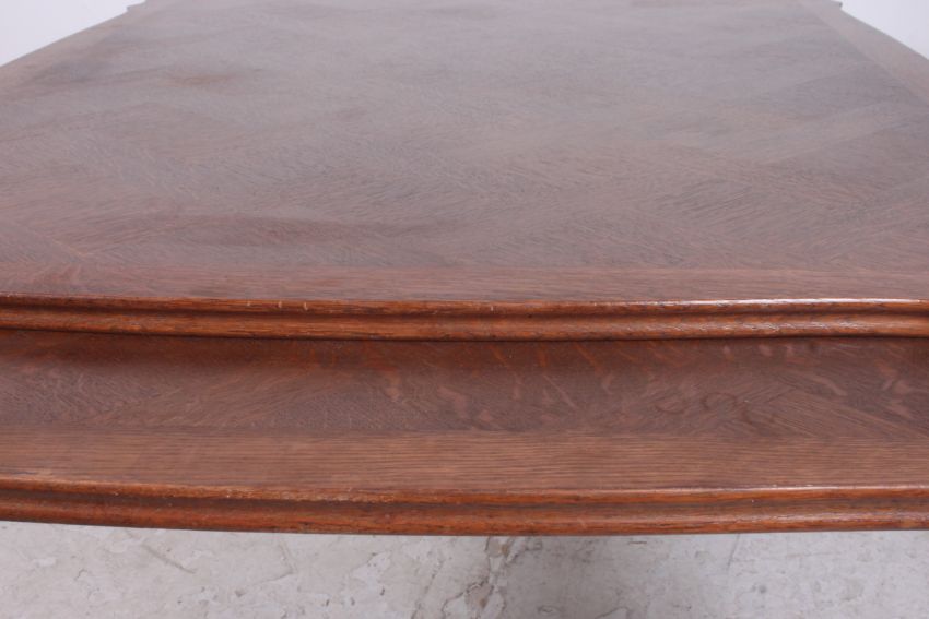 A 1930's Oak large French refectory dining table raised on cabriole legs with hoof feet having a parquetry inlaid top with draw leaves to each end