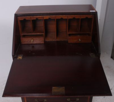 An Edwardian mahogany inlaid ladies writing bureau, Raised on bracket feet with a bank of drawers under fall front slope with appointed interior within. Finished with a conch shell inlaid detail to centre. Measures: 96cms x 60cms x 44cms.