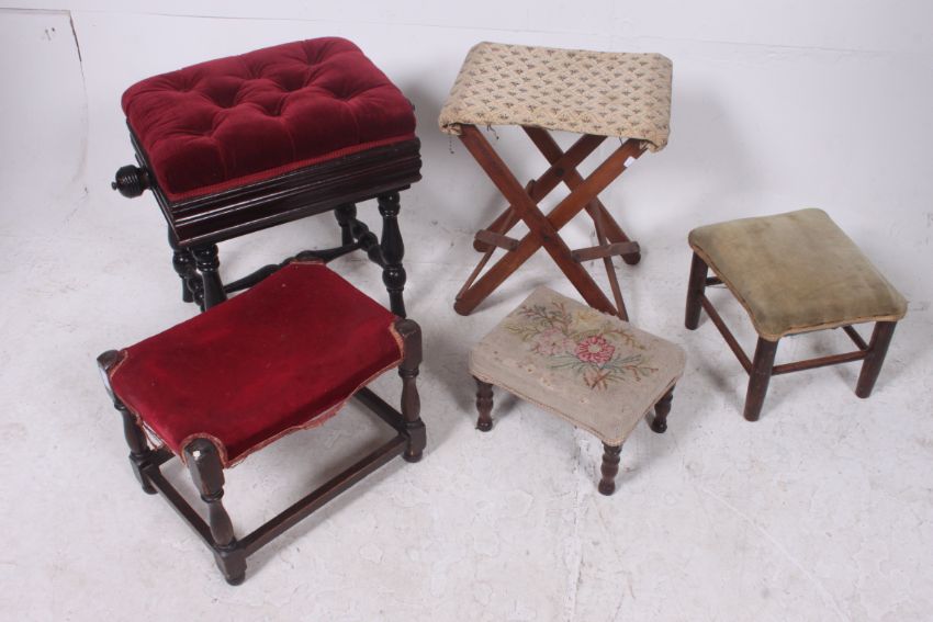A collection of five stools to include an adjustable piano stool, foot stools please see images.