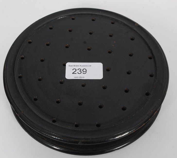 A 19th century ebonised wooden ivory solitaire game. The circular wooden board opening to reveal ivory playing pieces. Measures 18cms diam