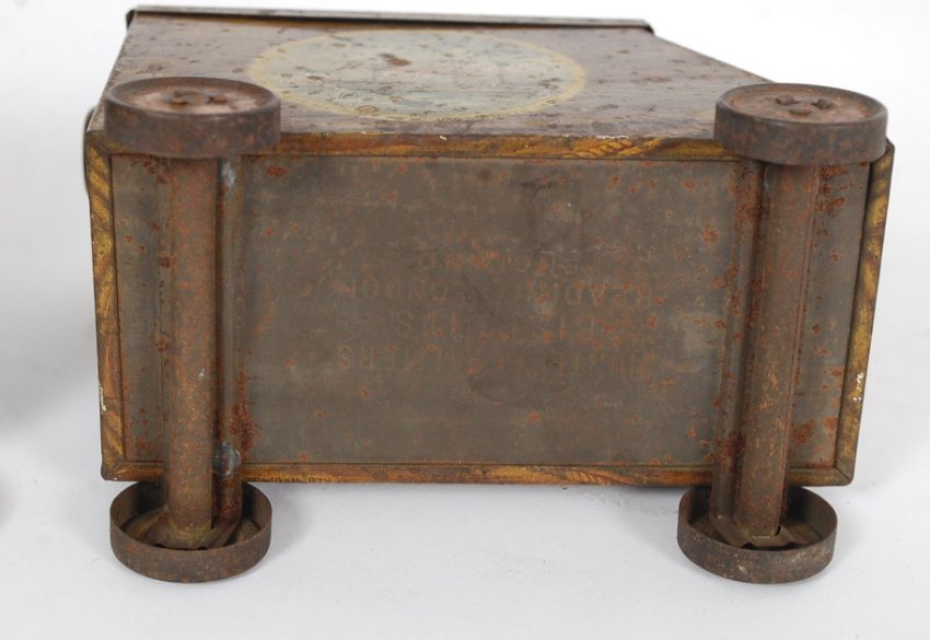 A 1914 Huntley & Palmer " cannon " biscuit tin featuring Nelsons flagship Victory. In the shape of an old cannon located on the surface of the hinged lid mounted on a simulated wooden carriage. On one side panel is a picture Victory at Trafalgar in 1805 and on the other side the Victory at Portsmouth in 1914 . Together with a W & R.Jacob & Co Tin-Carriages Coronation coach, Figural biscuit in tin stamped for W & R.Jacob