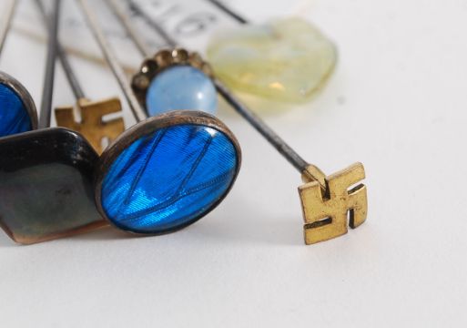 A collection of vintage ladies hatpins to include 2 with Nazi Swastikas, butterfly wings, diamond lozenge and others