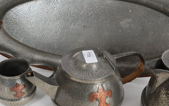 A 19th century Arts & Crafts pewter and copper overlaid tea and coffee set in the manner of Liberty / Tudric. Comprising teapot, coffee pot, sugar bowl, creamer and tray. Stamped to base Prov Patent No 31153 English Pewter