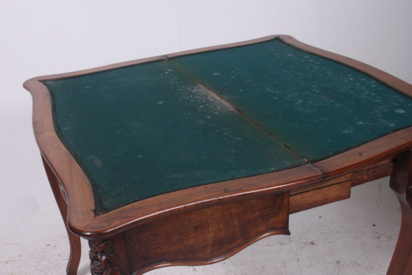 A 19th century continental biedermeier walnut card table. Raised on shaped supports having serpentine body with flip over baize lined table top. Measures: 72cms x 82cms x 42cms.