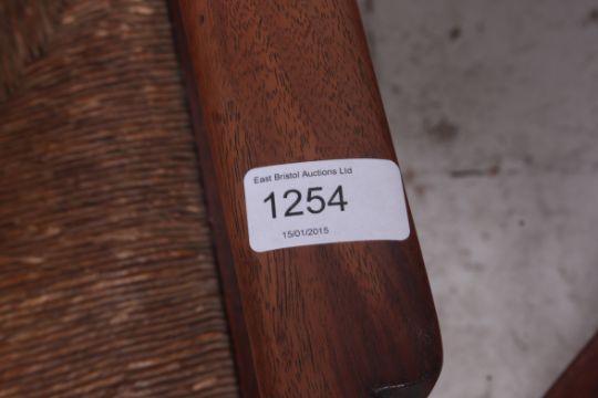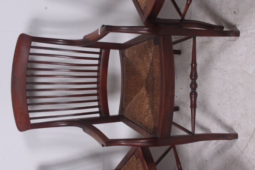A set of 5 19th century mahogany dining chairs raised on sabre supports having rattan weave seats under bar back rests above