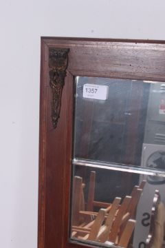 A large french rectangular wall mirror set within a mahogany frame having quartered/sectioned mirror atop. Measures: 144cms x 77cms.