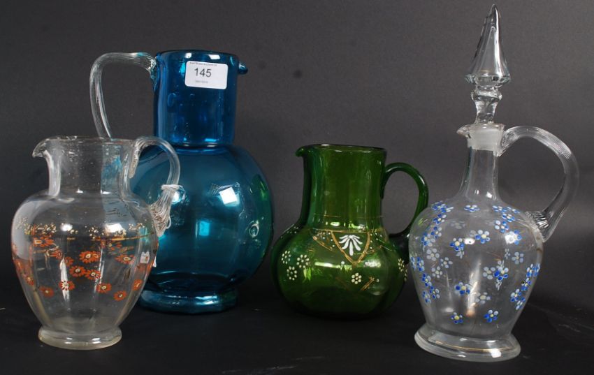 A collection of 4 pieces of 19th century glass to include hand painted decanter, green glass handpainted jug, blue glass pitcher and another