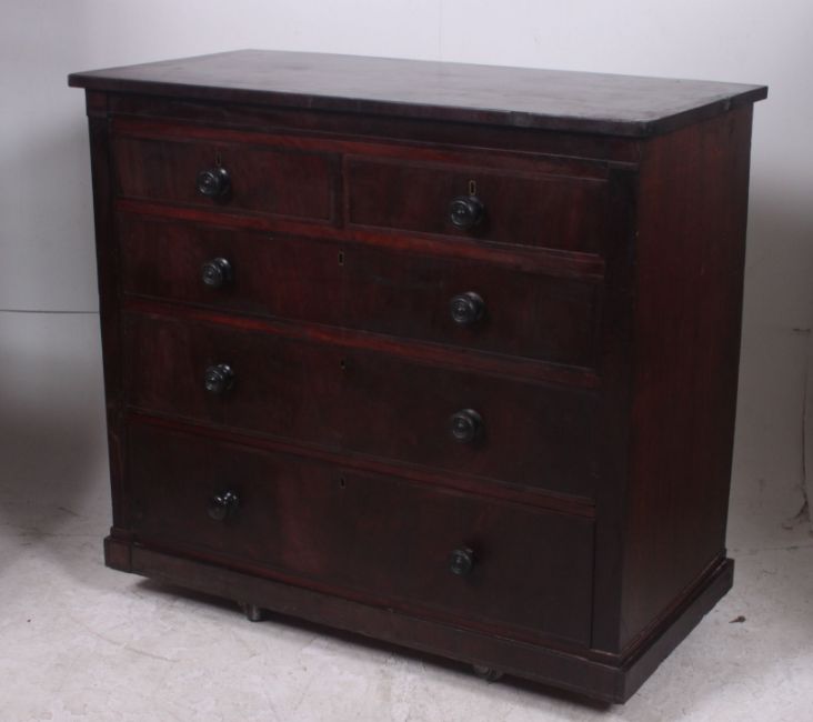A good Victorian mahogany crossbanded chest of drawers having plinth base with flared top and knob handles.